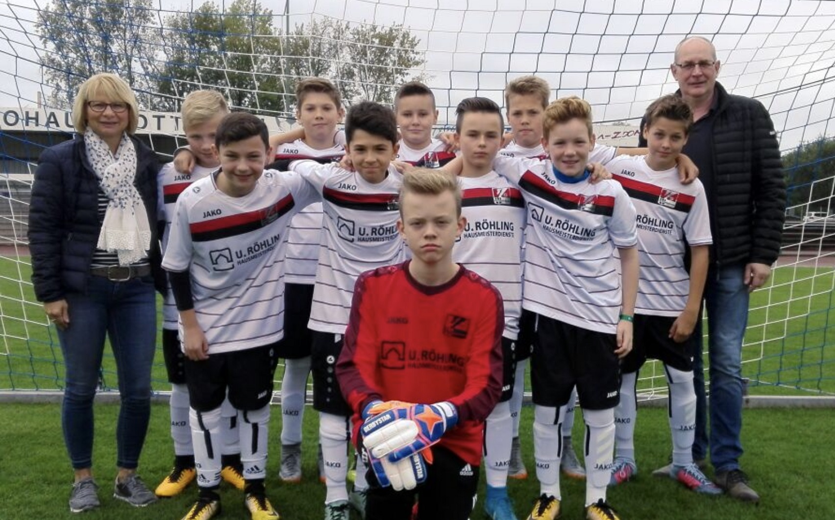 Die D2-Jugend freut sich über einen nagelneuen Trikotsatz. Gesponsert wurden die Schwarz-Weißen Jako-Trikots von der Firma Hausmeisterdienste Röhling in Kirchhellen. Uli und Sabine Röhling kamen persönlich vorbei und übergaben der Mannschaft die neue Ausrüstung.